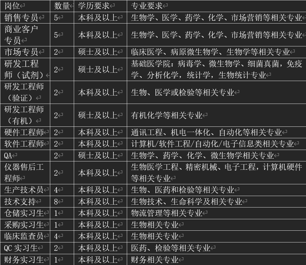 专业要求:生物化学与分子生物学、细胞生物学、遗传学、医学检验、微生物学、临床医学等相关专业