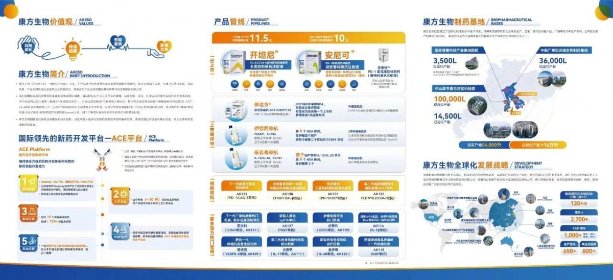 自成立以来,公司打造了独有的端对端康方全方位新药研究开发平台(ACE Platform),建立了以Tetrabody双特异性抗体开发技术、抗体偶联(ADC)技术平台、mRNA技术平台及细胞治疗技术为核心的研发创新体系,国际化标准的GMP生产体系和运作模式先进的商业化体系,成为了在全球范围内具有竞争力的生物医药创新公司。