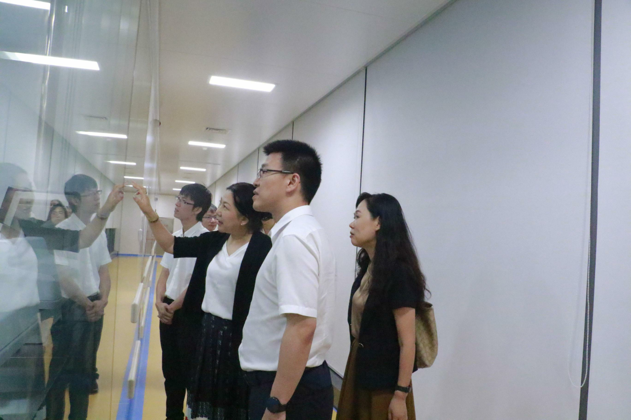 康方生物在全国多地均设有临床开发和研发中心等,其中康方湾区科技园位于孙中山故乡广东中山翠亨。在调研过程中,夏瑜校友向谢湜副校长一行介绍了中国生物制药崛起历程以及康方生物的发展情况,特别针对康方生物独立自主的全球领先科技、新一代肿瘤免疫治疗基石药物、公司发展布局、生产车间等方面进行了详细介绍。