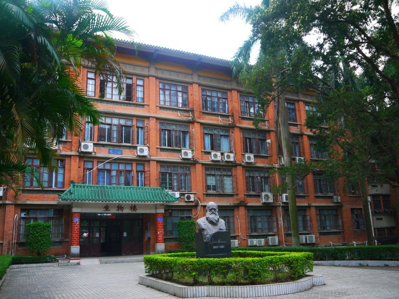 红砖绿瓦的旧生物楼前