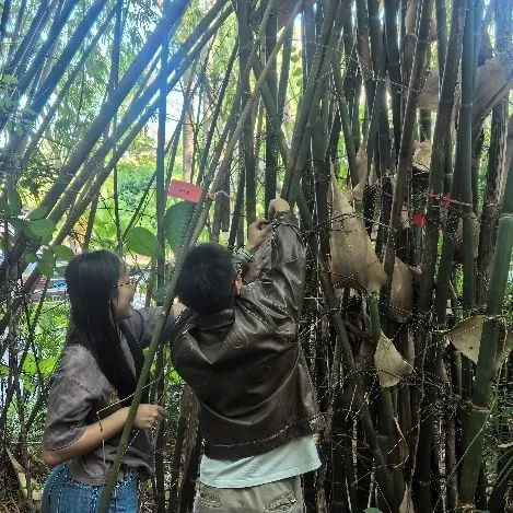 紧接着,教职工党支部的老师们引领学生支部成员步入幽静的竹园,开展竹种挂牌活动。在这个过程中,大家对中大竹园丰富多样的竹种有了更为深入的认知。这座竹园不仅是国内种类最为丰富的竹种标本园之一,更珍藏着我国数量最多的竹类活体模式标本,为早期的华南植物园竹园提供了近半数的竹种资源。除了竹子外,本竹园也零星种植有其他珍贵的植物,如国家一级保护植物猪血木(Euryodendron excelsum,山茶科),该植物由是中国近代植物分类学的开拓者和奠基人之一的陈焕镛院士亲自引入种植的。另外还有亚洲av