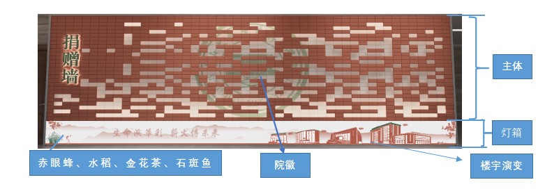 捐赠墙中间校徽位置,从中心向四周铭刻大额度捐赠者姓名或集体信息,两边从上向下按高年级(入学时间)到底年级顺序排布。