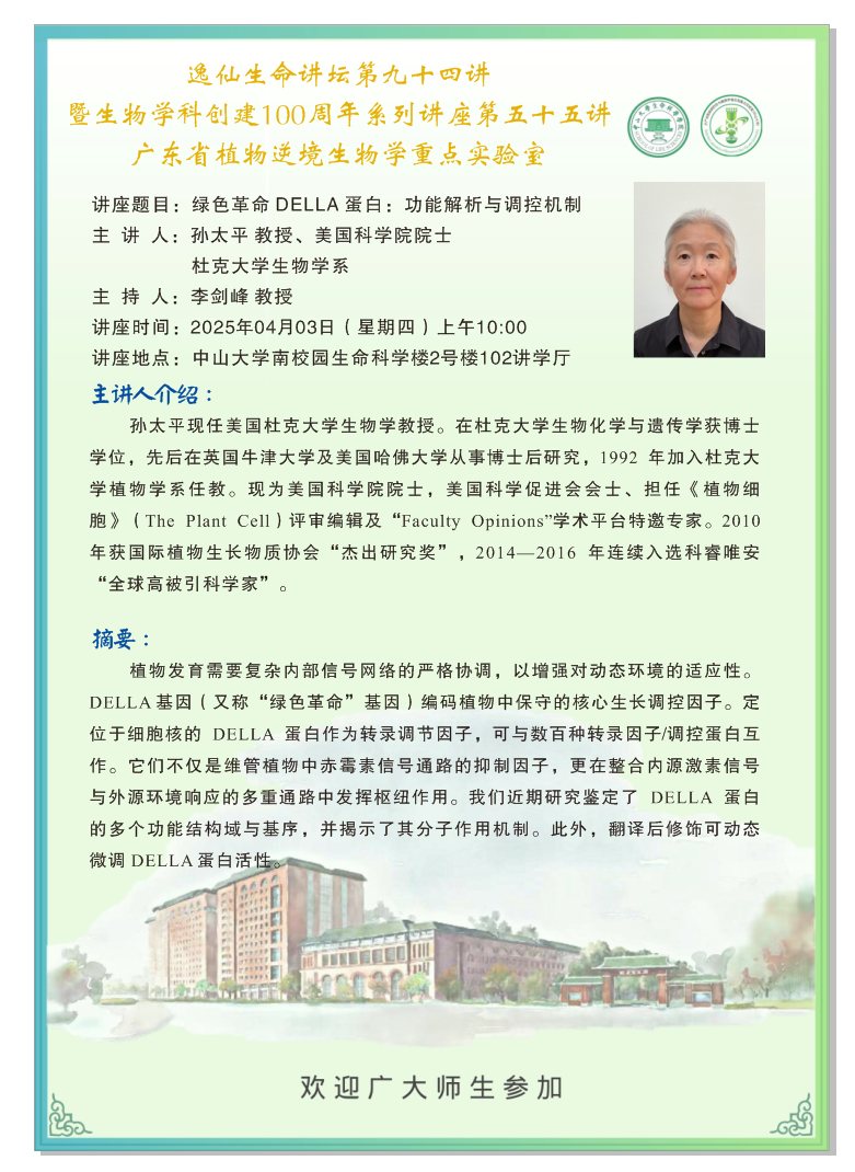 2025年4月3日亚洲av 逸仙生命讲坛第94讲:绿色革命 DELLA 蛋白:功能解析与调控机制